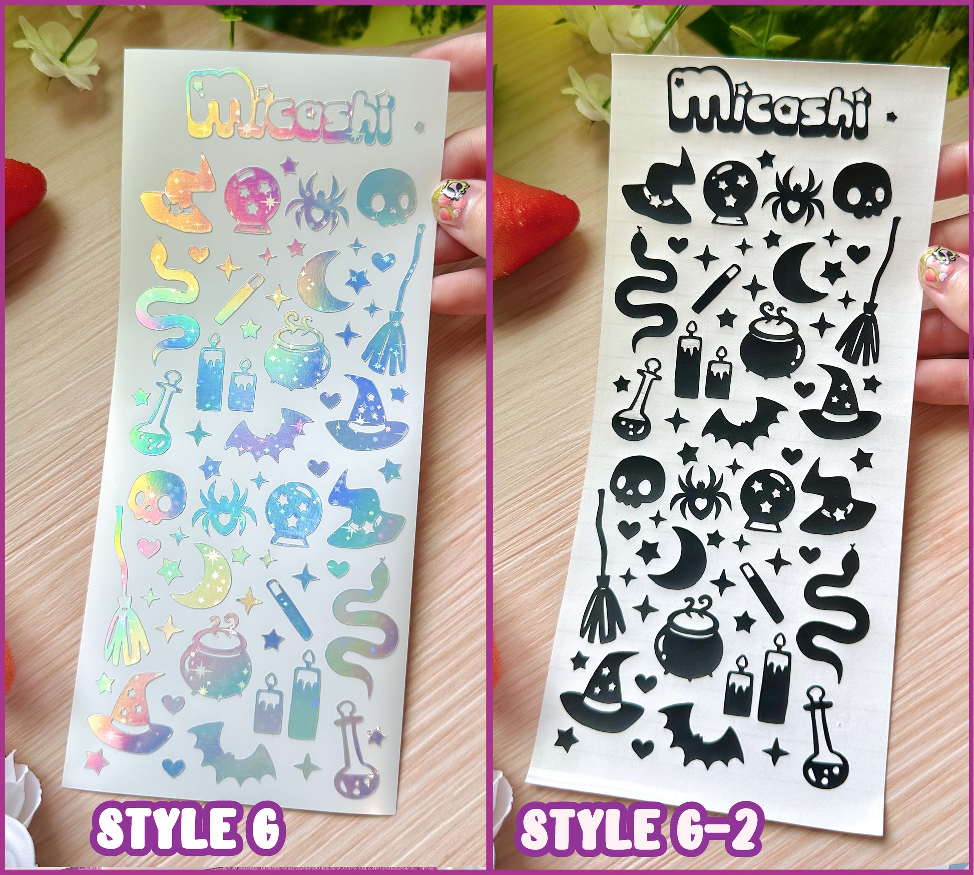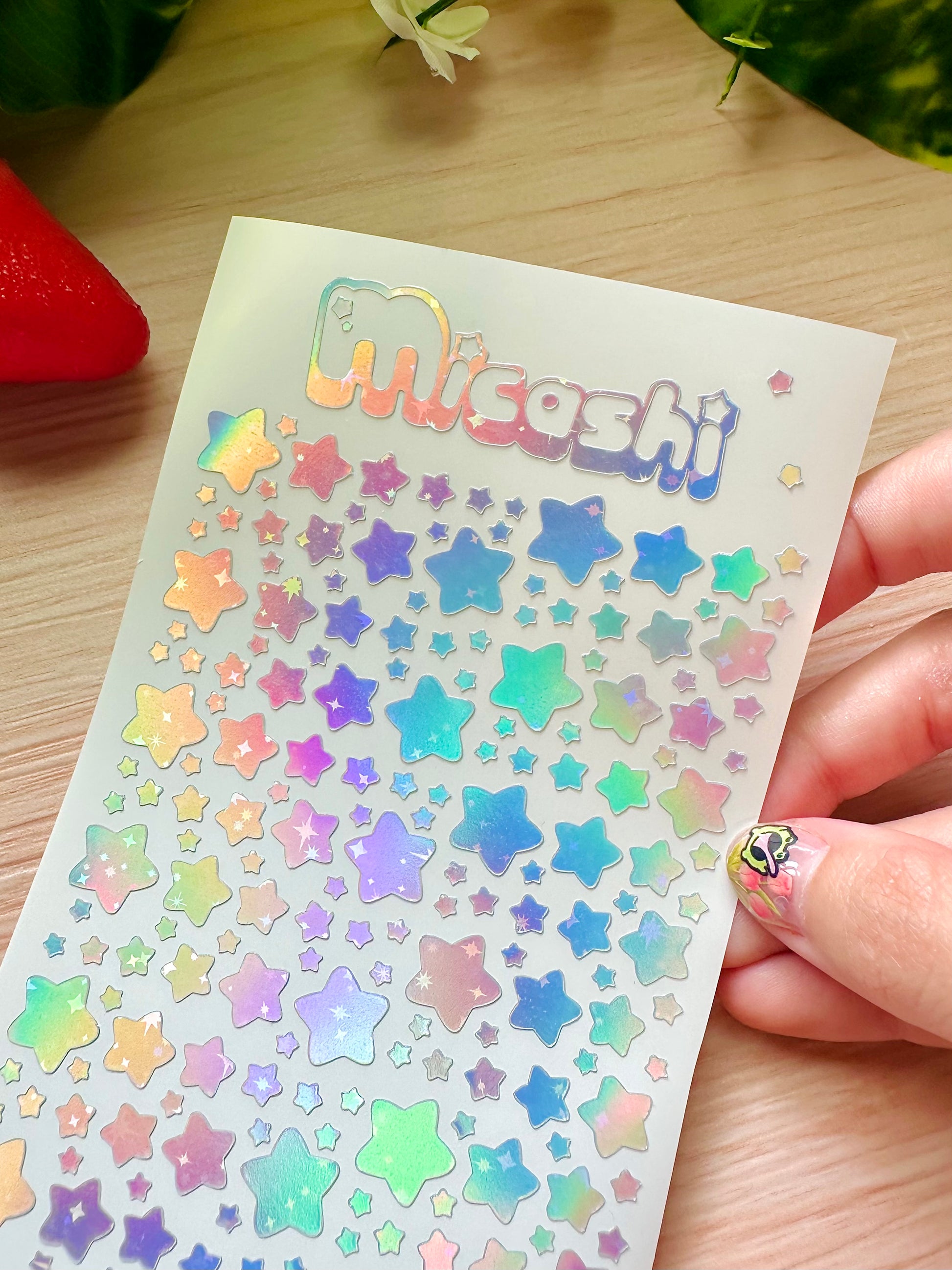 This product has been improved, the sticker sheet has gone from 3.4“x7” to 3.5“ x 8”, and the holographic vinyl is now laminated with a layer of holographic stars, making the material more attractive, durable, and waterproof!